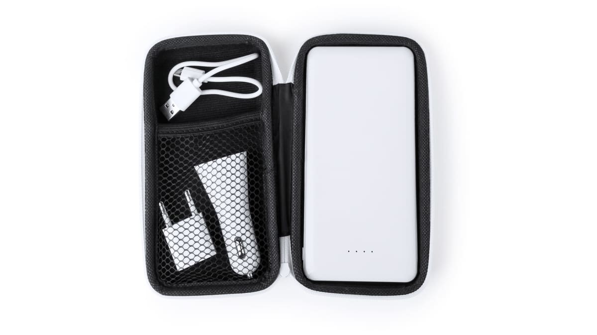 Features:  Power bank with 8,000 mAh and ultra slim design, 2,100 mAh car lighter charger with dual USB output, and 1,000 mAh wall charger. Presented in a stylish and resistant white PU leather case and including micro USB cable. The capacities shown in a