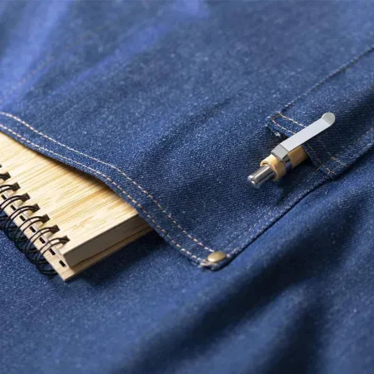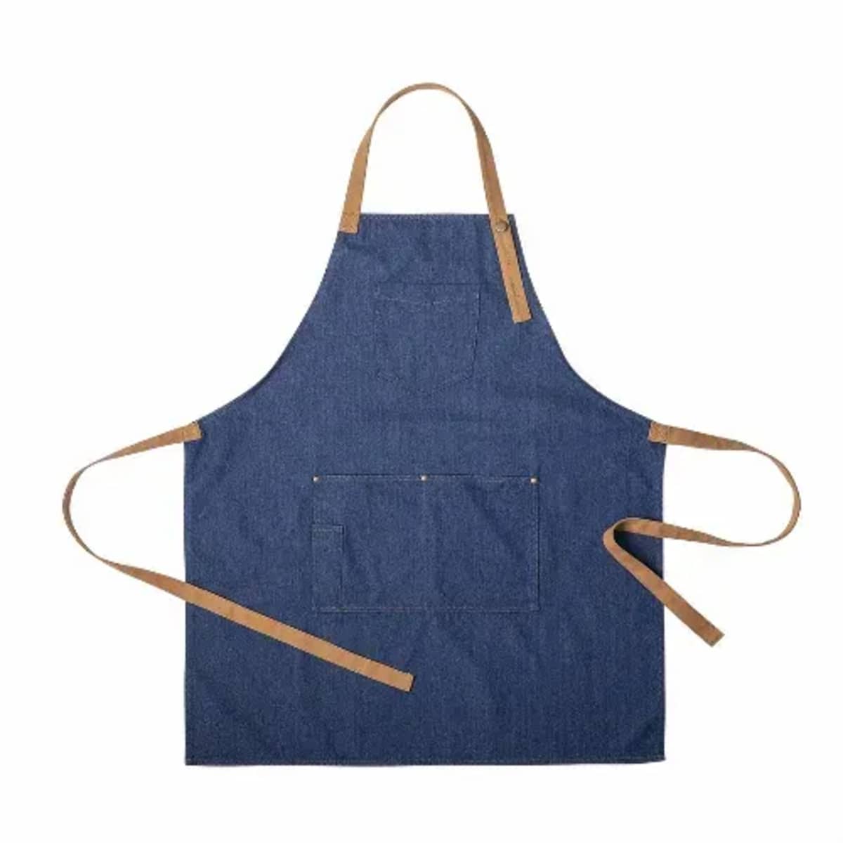 Features:  Fitting under the knee, with button adjustable neck strap and reinforced, brown color waist straps. Multiple pockets for convenient storage and access to utensils. Reinforced stitching and metal rivets.