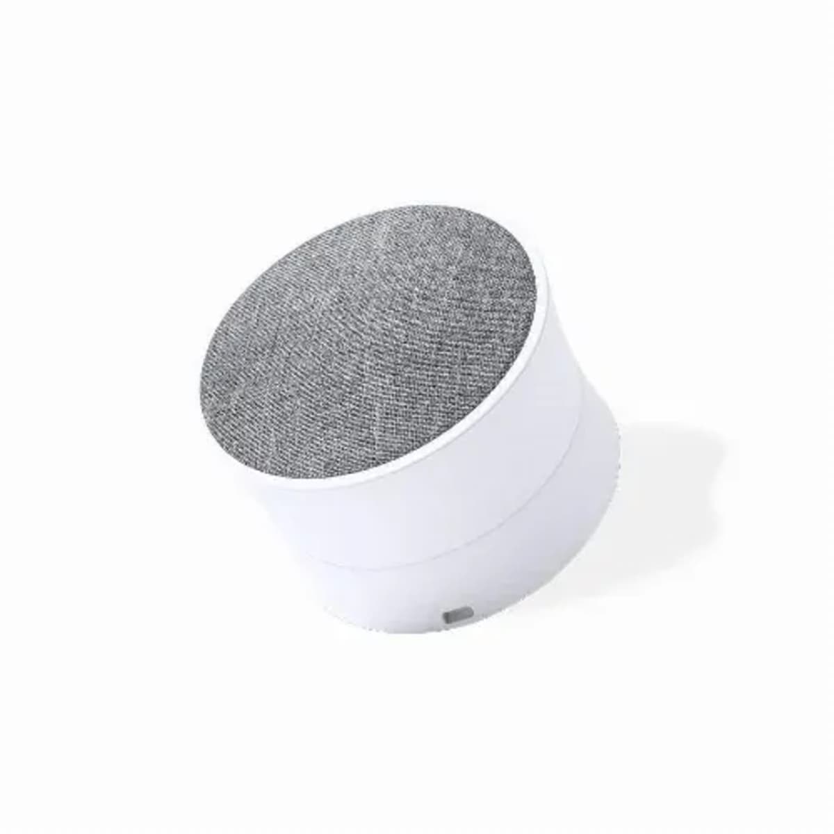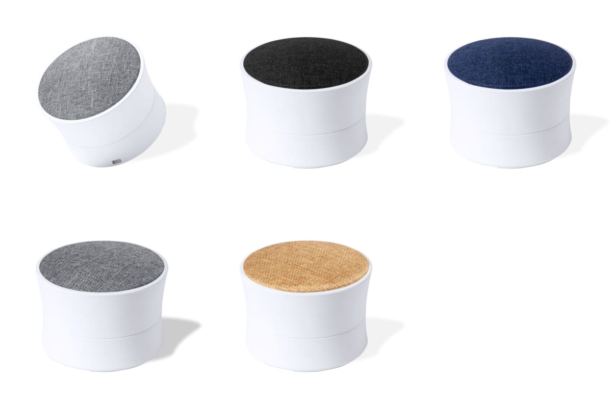 Combination of white ABS body with polyester and polyester grille in a wide range of colours. 300mAh lithium battery, with Type C charging cable included. Presented in an individual kraft design box, with instruction manual in English and Spanish.