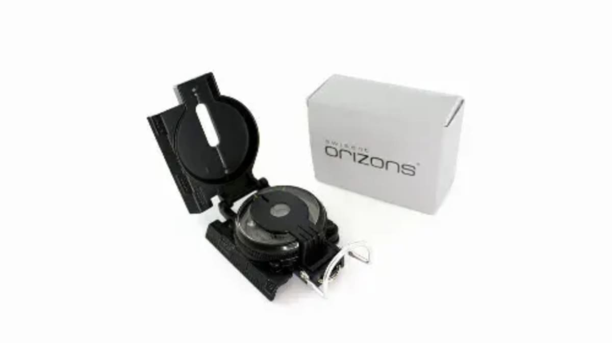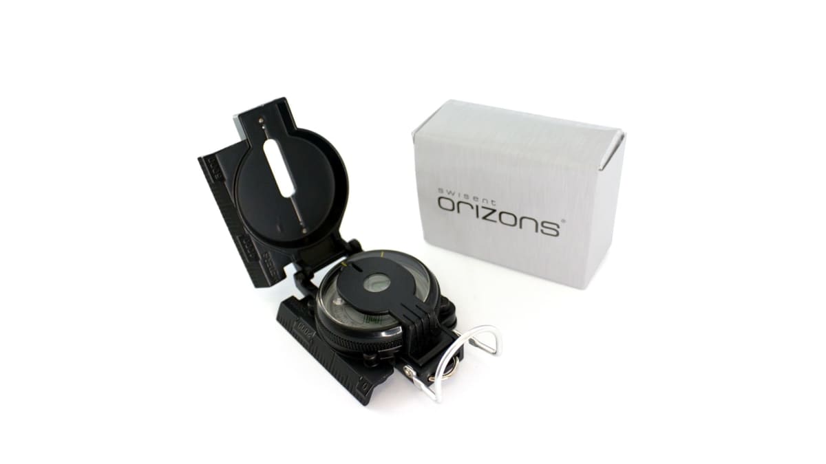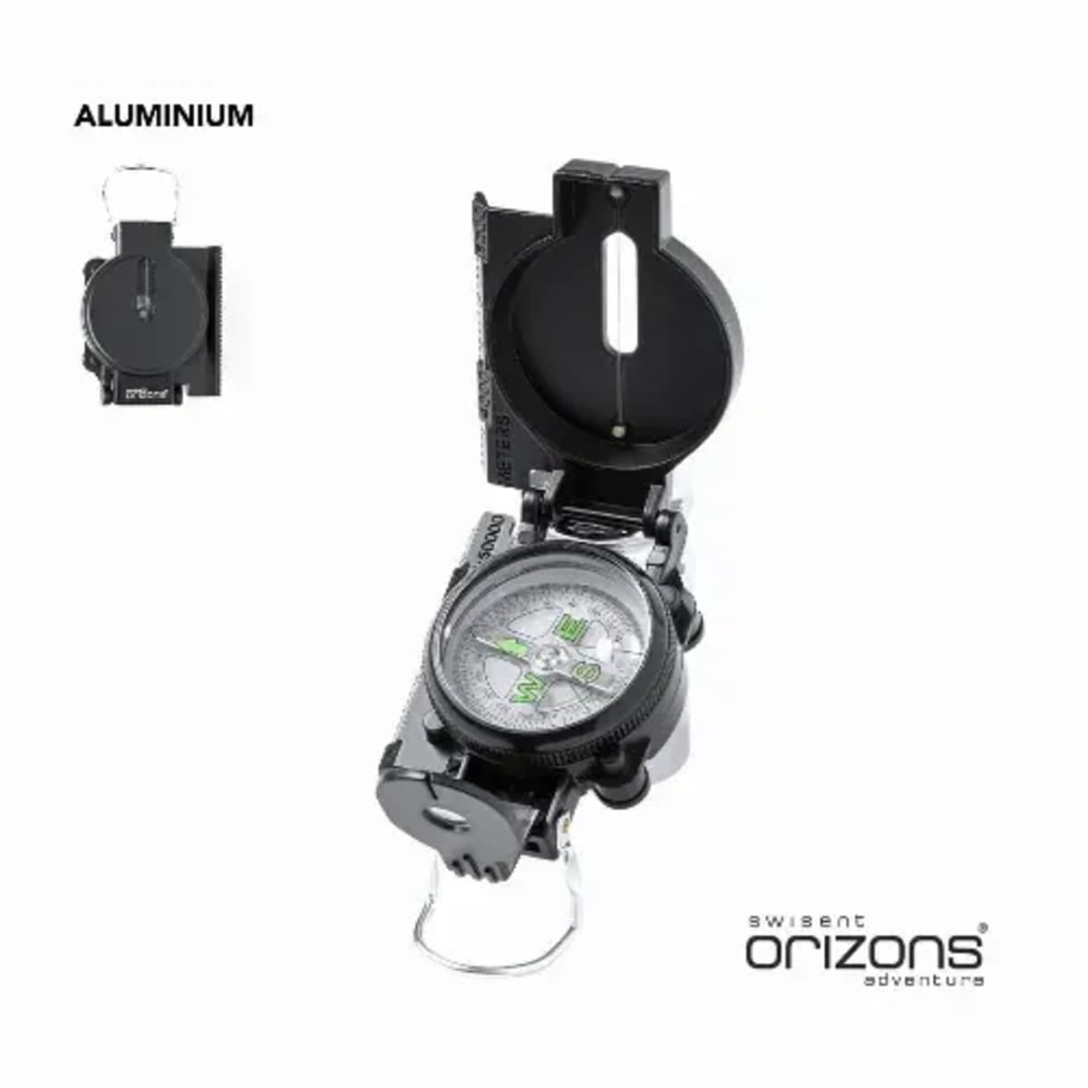 High precision Orizons compass in resistant aluminum, with fixing accessory and presented in an attractive design box with the brand logo..
