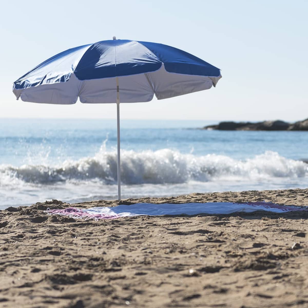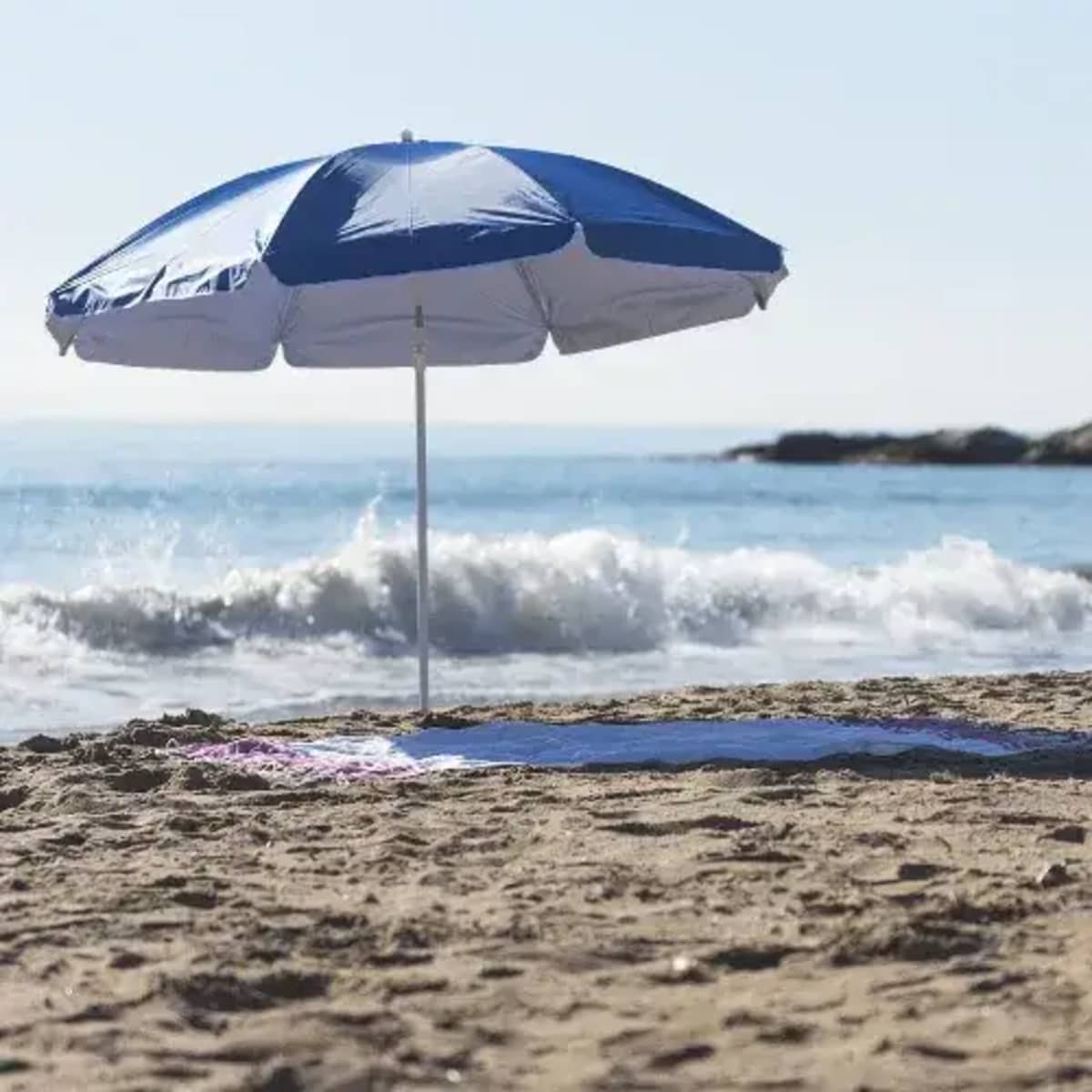 Telescopic pole, adjustable in height and inclination. 200cm in diameter, side flaps with piping and metal coated tubes in white color. In a wide range of bright colors, comes inside a nylon sleeve with shoulder strap.