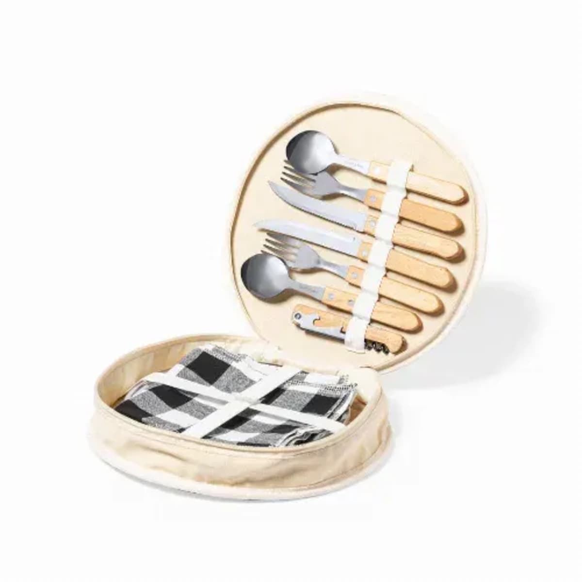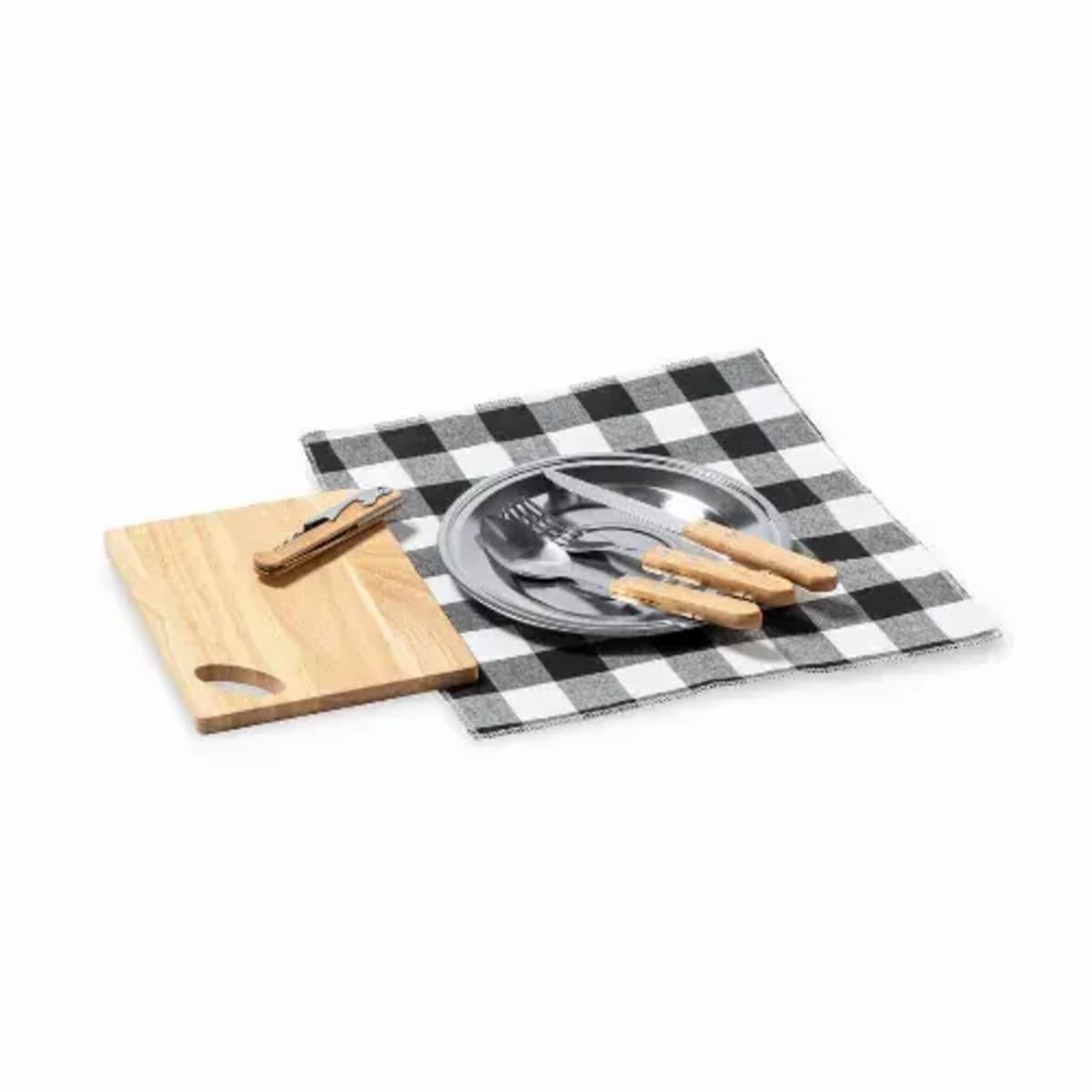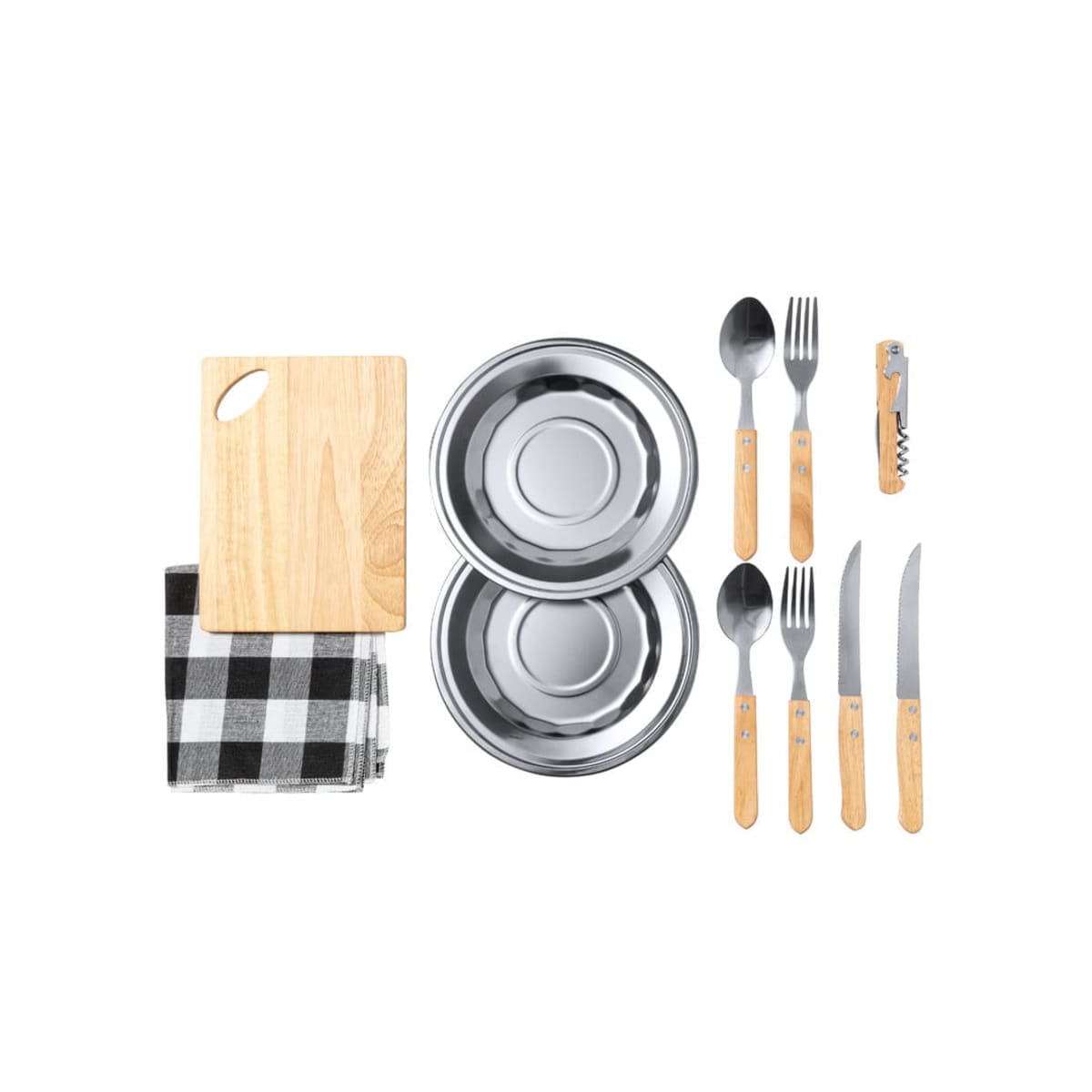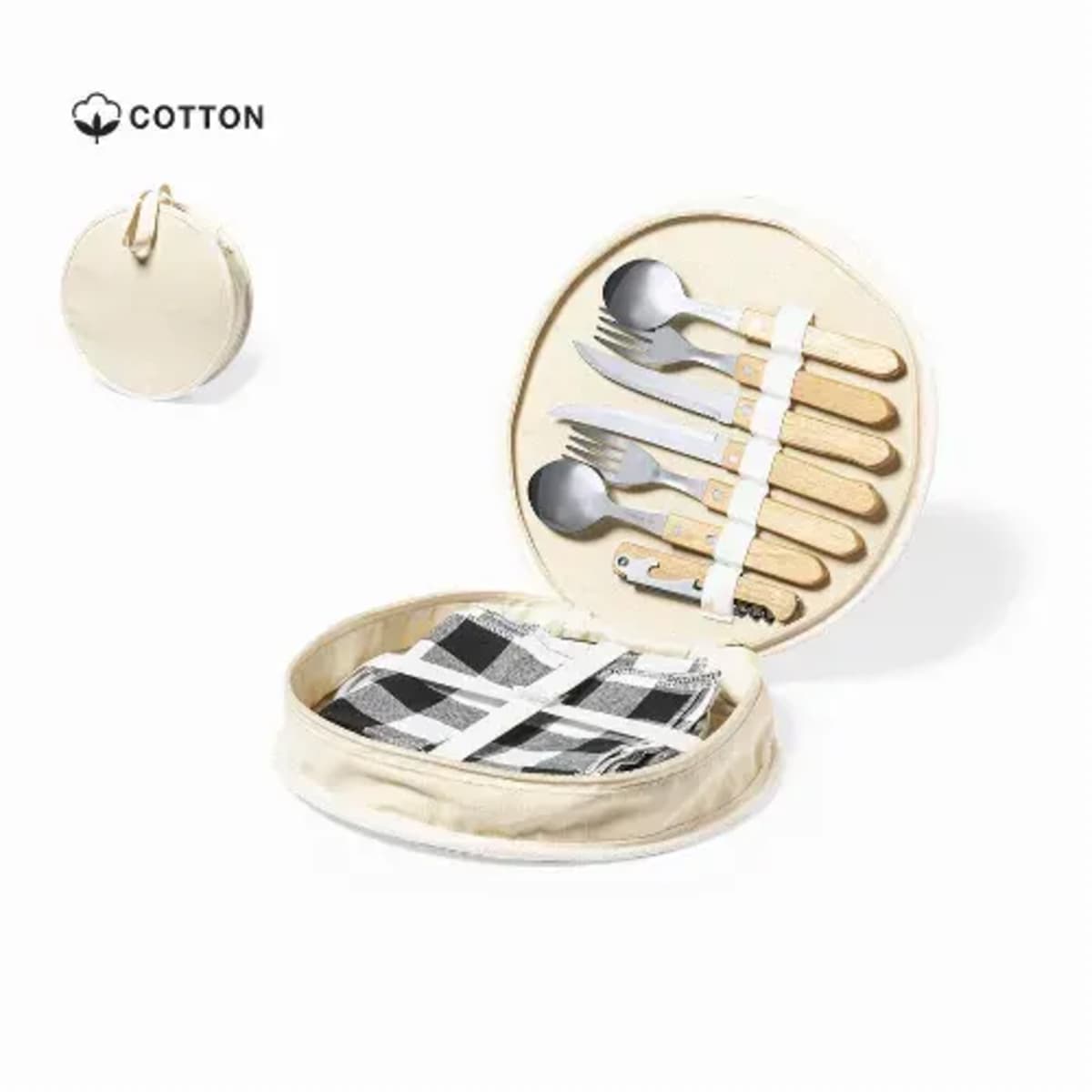 Features:  Presented in a resistant cotton bag with natural finish, zip closure and carry handle. Reinforced inside, with compartments for the different accessories. Contents: 2 spoons, 2 knives and 2 forks in stainless steel with natural wooden handle. 2 p