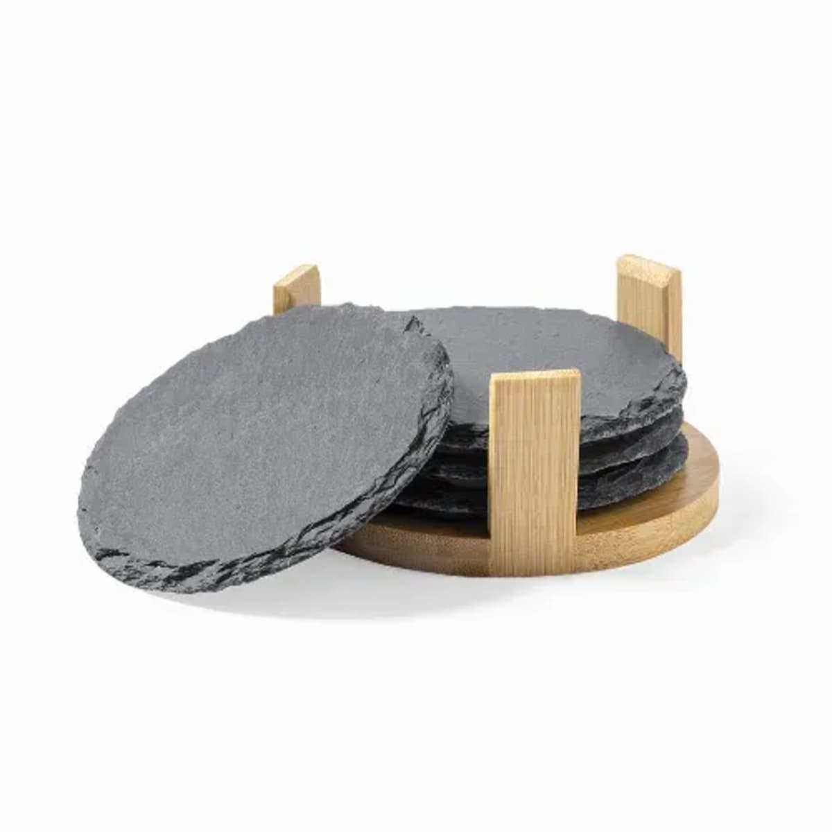 Set of 4 coasters made of natural slate, with bamboo holder.